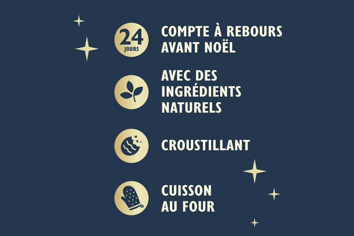 Quoi de mieux pour faire naître cette magie chez nos fidèles compagnons que leur propre calendrier de l’Avent rempli de biscuits de Noël dorés au four ? Votre chien aussi a droit à sa friandise quotidienne avant Noël :