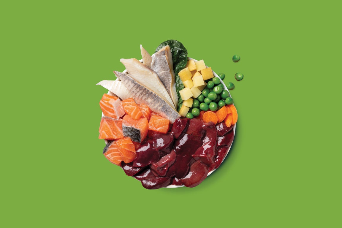 Tacchino* (30%), salmone* (15%), aringhe* (15%), patate* (4%), piselli*, carote*, spinaci*, sostanze minerali, olio di canapa*, solidago*, ortica*, semi di anice*, cinorrodi*, fiori di calendula*, attaccamani*, centocchio*, alfalfa*, cardo mariano*, radice di tarassaco*, radice di lappola*, semi di sedano*.