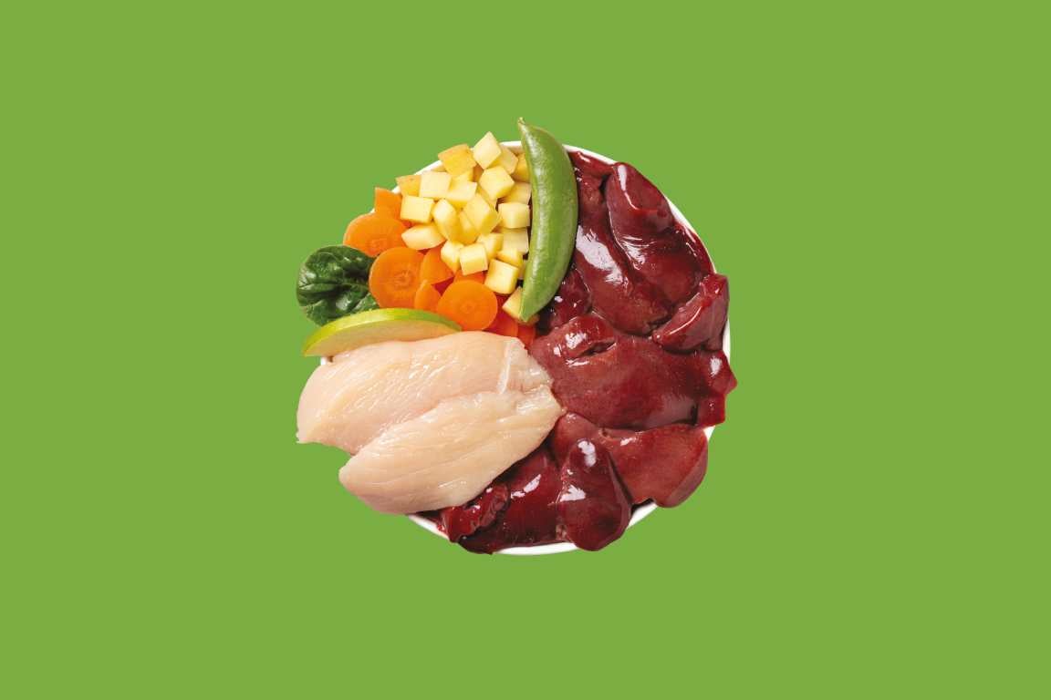 Pollo* (60%), patate* (4%), piselli dolci* (2%), carote* (2%), spinaci* (1%), mele*, sostanze minerali, olio di cartamo* (0,1%), solidago*, ortica*, semi di anice*, cinorrodi*, fiori di calendula*, attaccamani*, centocchio*, alfalfa*, cardo mariano*, radice di tarassaco*, radice di lappola*, semi di sedano*. *Ingredienti naturali.